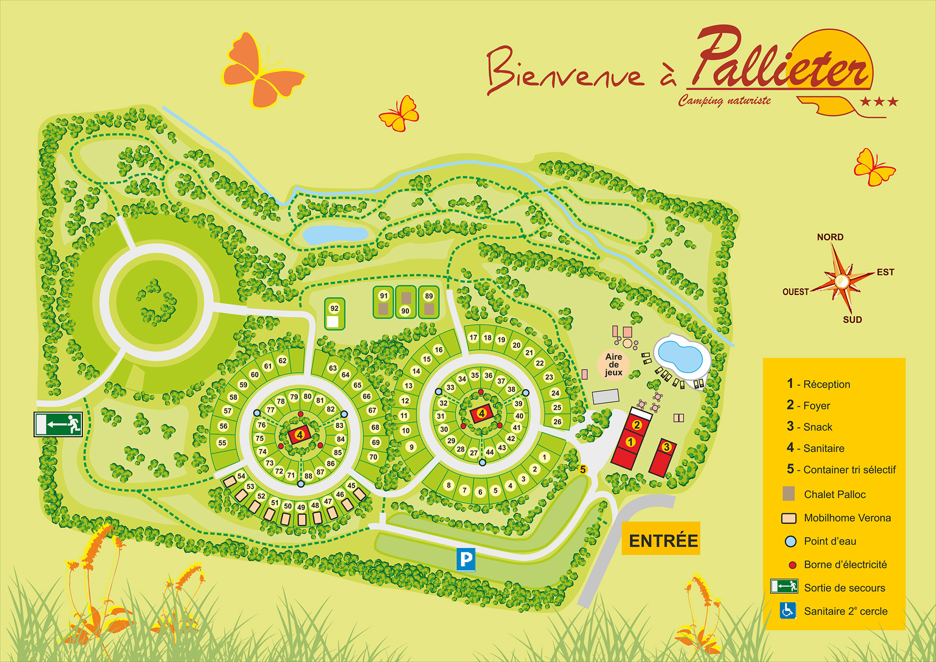 Les emplacements sont dispersés en cercle et au milieu des cercles, vous trouverez les sanitaires.
