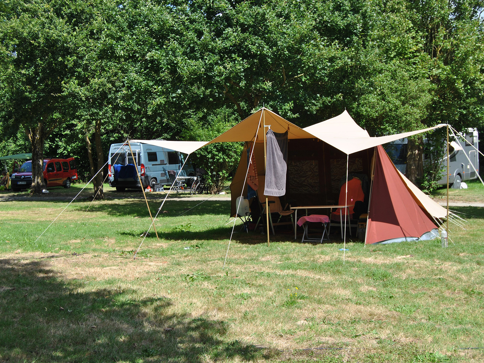 Nos emplacements sont dispersés en cercles autour d’un bloc sanitaire. Chaque cercle a trois points d’eau, donc vous n’êtes jamais loin.